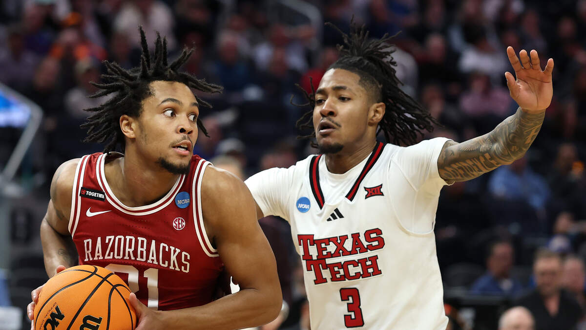 D.J. Wagner #21 of the Arkansas Razorbacks works against Elijah Hawkins #3 of the Texas Tech Red Raiders during the second half in the West Regional Sweet Sixteen round of the NCAA Men's Basketball Tournament at Chase Center on March 27, 2025 in San Francisco, California. Photo: Ezra Shaw / Getty Images Sport / Getty Images
